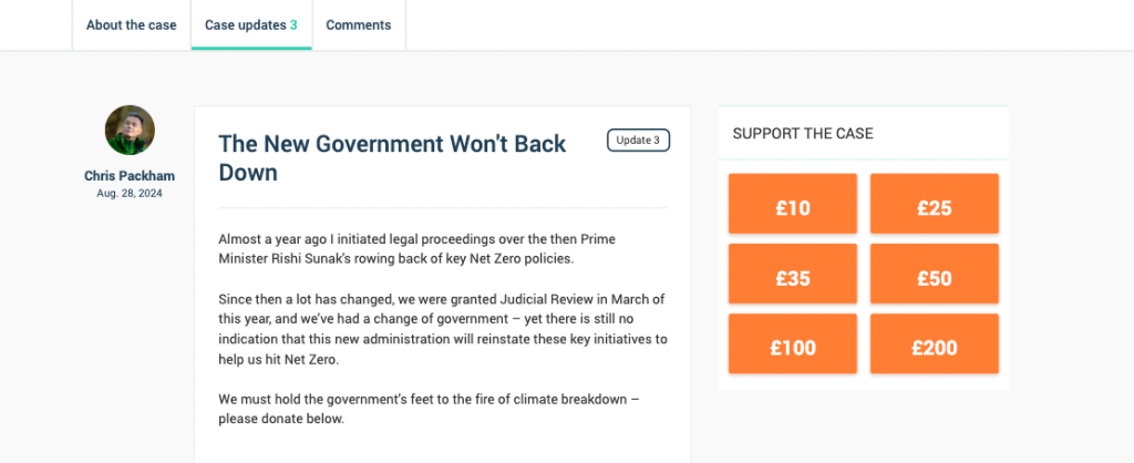 An update on the legal case which I initiated almost a year ago now. Cast your mind back, the then Prime Minister Mr Sunak rowed back on three key Net Zero policies: the transition to electric vehicles; the installation of heat pumps rather than gas boilers; and ensuring that landlords properly insulate their tenant homes. We believe that these were integrally important when it comes to meeting those Net Zero commitments. But, time has moved on, and we do have a new government. They have reached out to us about this case, but at this point there is no indication that they are going to reinstate those policies and address other issues of transparency. So, I need to ask for your help. We’ve got to raise a little bit more money to ensure that we can hold Labour’s feet to the fire of climate breakdown.