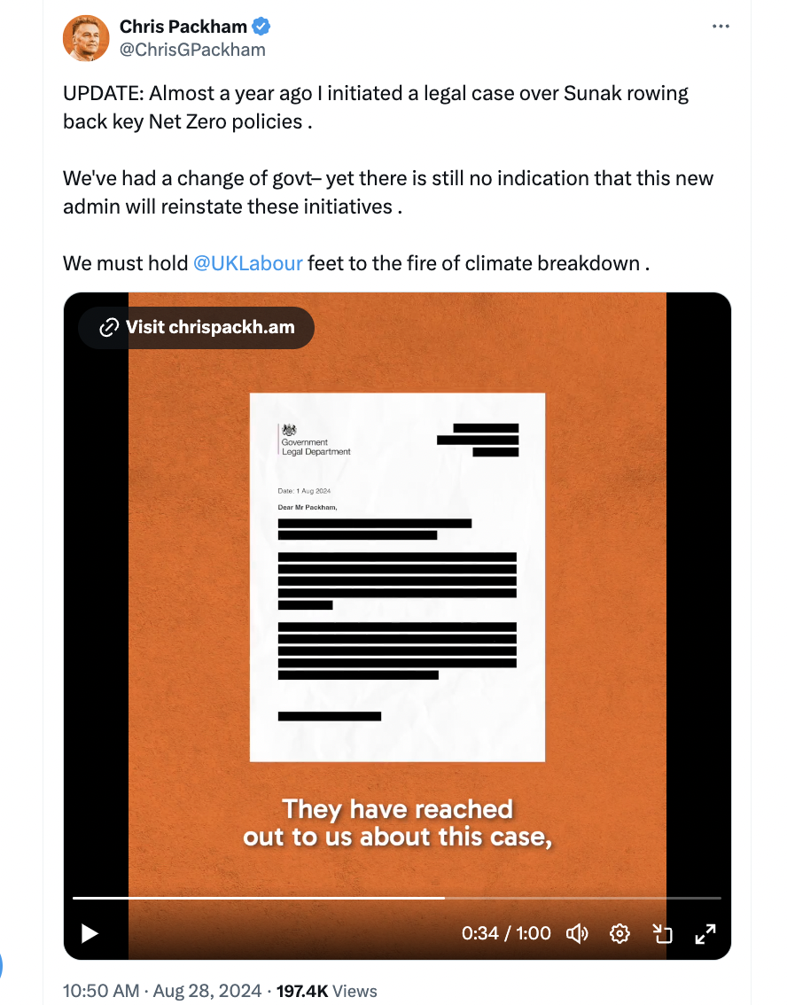 Given the evident brevity of the GLD’s letter, and the fact that Packham characterises it as the new Government ‘reaching out’ to him about his case, it seems likely that the GLD was writing to invite Packham to withdraw or at least defer his judicial review claim, in light of the change of government and the new Labour administration’s clear policy commitments on Net Zero (which Packham himself has warmly welcomed).