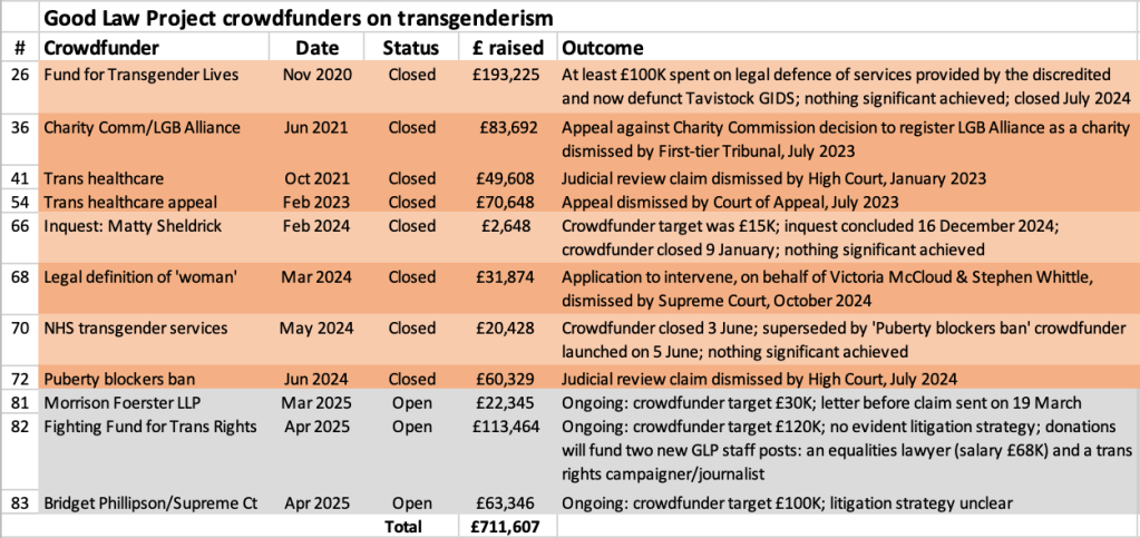 The Bridget Phillipson/Supreme Court crowdfunder launched by the GLP on Friday and parodied above is their eleventh crowdfunder on transgenderism, out of a total of 83 crowdfunders launched since March 2017. The 11 crowdfunders have raised more than £700,000, but have (so far) achieved nothing. Nada. Rien.
