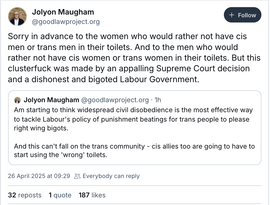 In the meantime, Jolyon Maugham KC is going to, er, wear a badge, and take selfies of him getting arrested in women’s toilets or other single-sex spaces.