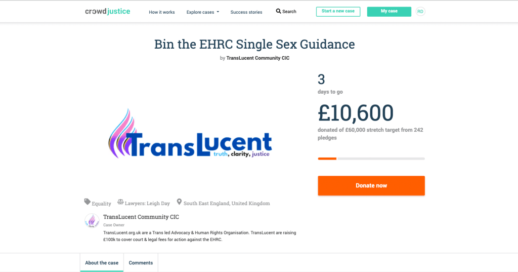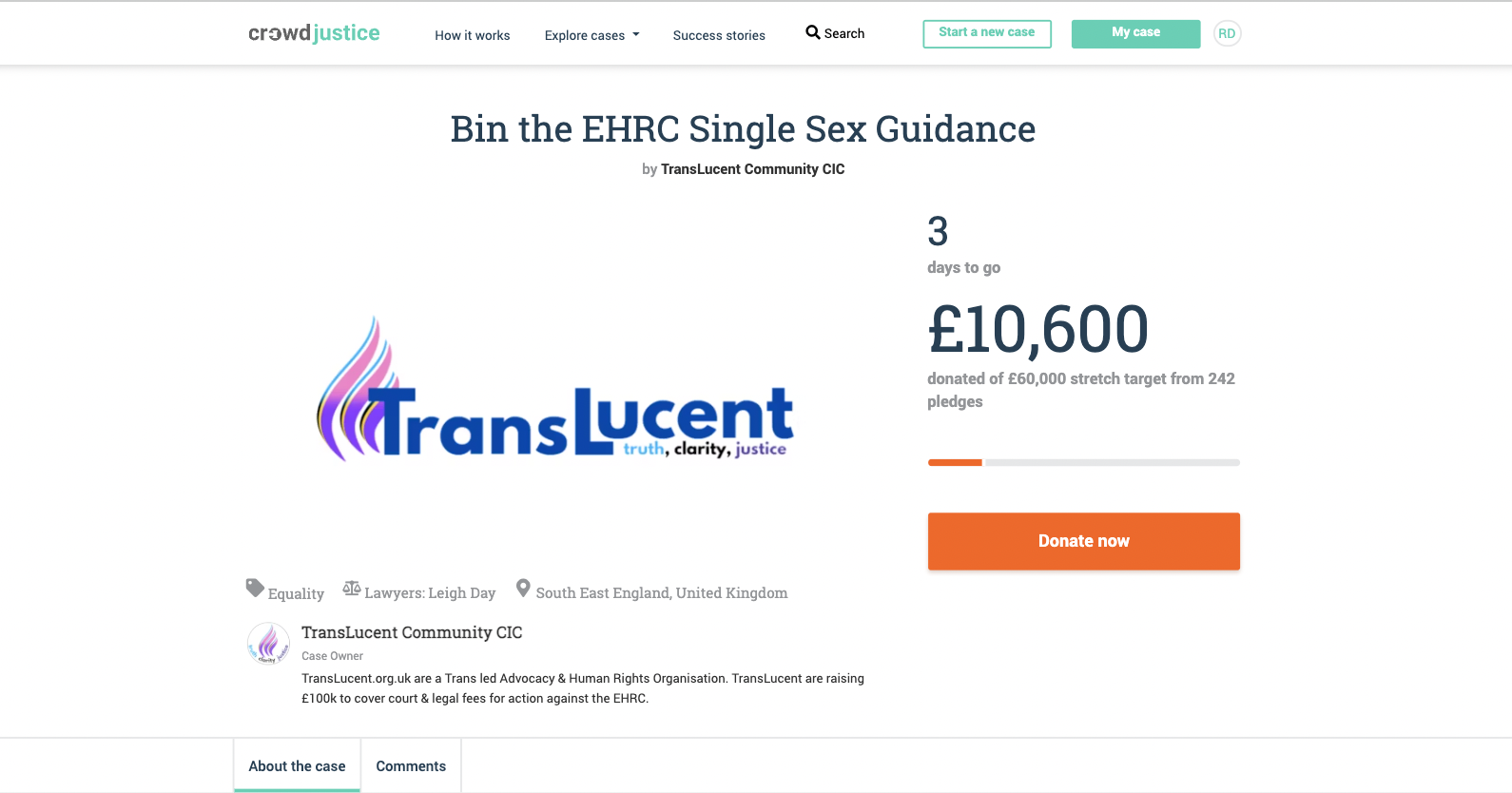 Next to take up arms against the EHRC was the “trans-led advocacy and human rights organisation” TransLucent, which on 13 May launched a crowdjustice crowdfunder in support of vaguely specified legal action aimed at forcing the EHRC to “withdraw the existing interim update, and [establish] a FULL and proper, twelve-week consultation”, as well as ensuring “a full, proper and independent review of the consultation responses before any new or amended [EHRC] guidance is published”.