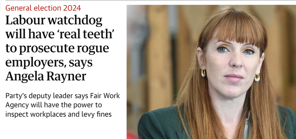 Whatever, in May this year Labour’s Plan to Make Work Pay updated the 2021 New Deal for Working People with a pledge that “Labour will deliver where the Conservatives have failed. We will finally establish a Single Enforcement Body to enforce workers’ rights, including strong powers to inspect workplaces and take action against exploitation.”