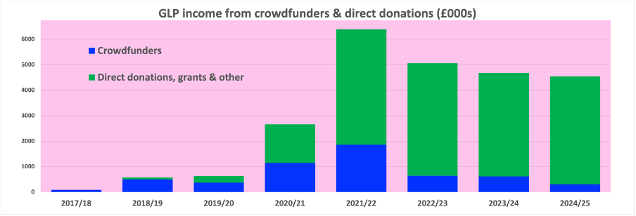 Meanwhile, the GLP’s income from crowdfunders plummeted, from some £450,000 per quarter in late 2021, to some £200,000 per quarter in late 2022, and just £40,000 per quarter in late 2024, after the demise of their Tory cash cow. And the GLP’s woeful record of ‘success’ in actually changing public policy continued.