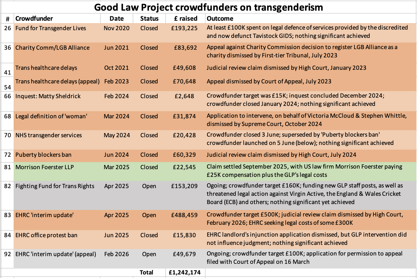 Since late 2020 – when, by her own account, the then 13-year-old ‘Grin’ was on the waiting list of the since discredited and now defunct Tavistock Gender Identity Development Service (GIDS) – the GLP has raised a total of £1.242 million from 13 crowdfunders in support of transgenderism-related lawfare. The first of these, launched in November 2020 in support of various legal actions in defence of services provided by the Tavistock GIDS, had raised £193,225 by the time it was closed in July 2024, without any significant change in public policy having been achieved.